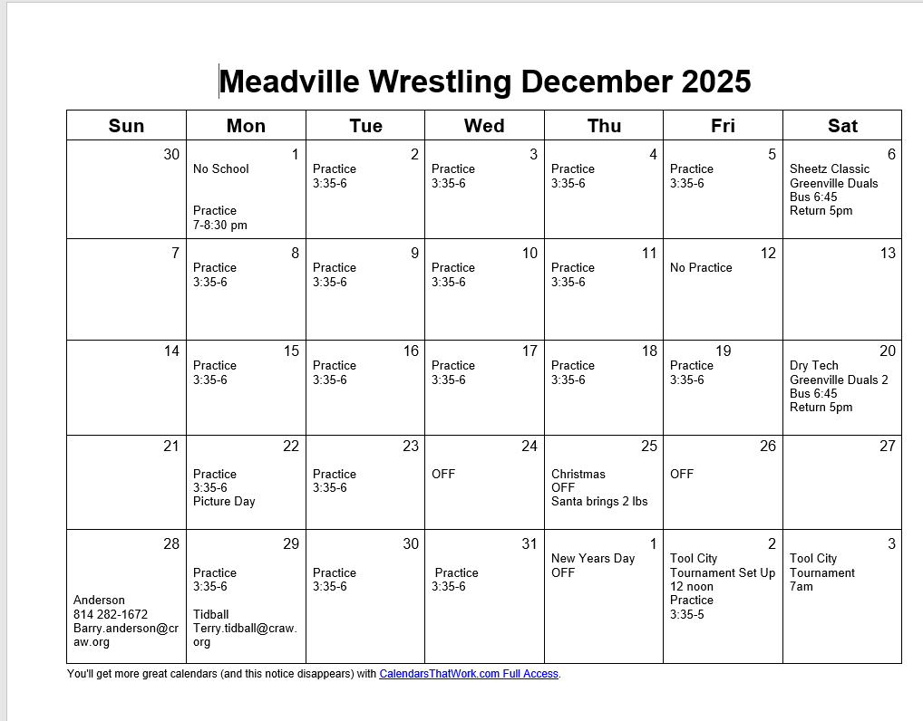 Practices: 2025-2026 season - Open mat will start November 3, 2025. Mandatory practices will begin November 10, 2025